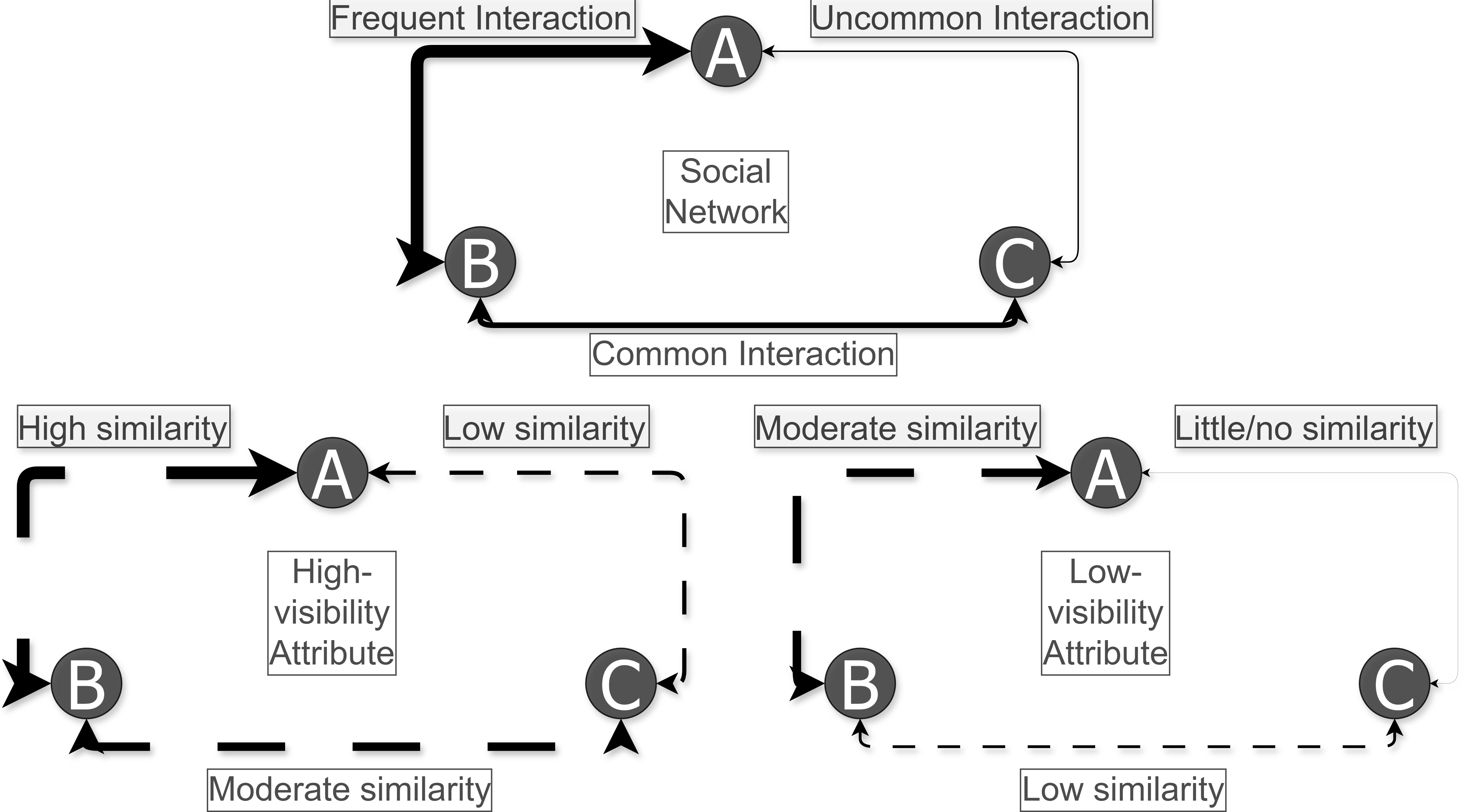 The visibility of an attribute also affects the level of transmission. Low-visibility attributes are more difficult to observe and copy than high-visibility attributes, although a sufficient degree of skill may be required. Figure 4 describes how this would affect material culture. Whereas high-visibility attributes may be easily copied, low-visibility attributes usually require careful observation of the crafting process. Communities of practice generate commonalities in low-visibility attributes representative of the strong relational connections within them. Constellations of practice represent greater diversity in practice but still share relational connections through historical, kinship, geographical, or other associations (Van Oyen 2016; Wenger 1998, pp. 126–133). As discussed, sharing high-visibility attributes indicates a categorical connection but does not require frequent interaction. Thus, levels of visibility can be used to infer categorical and relational connections among communities (see Upton 2019).