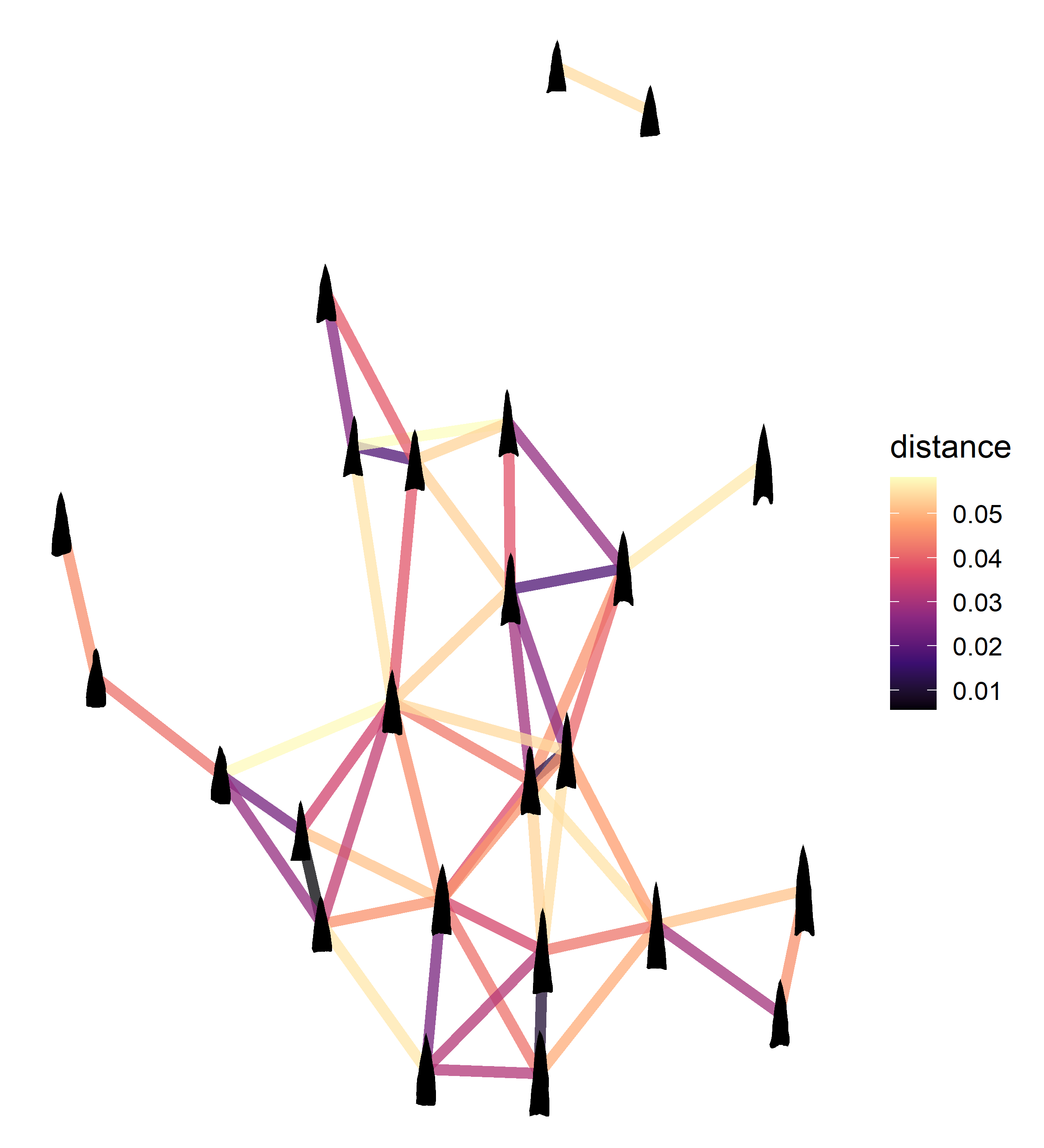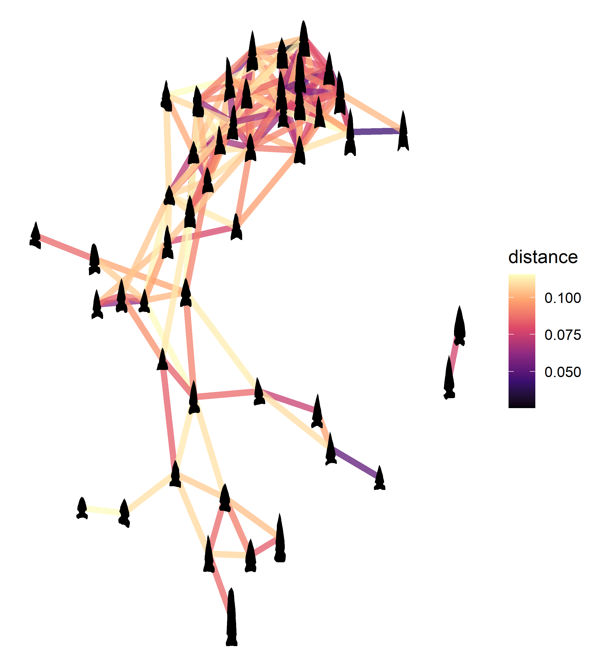 The simplest network is the spatial network. This network was created by calculating the Euclidean distance from every site to every other site. Euclidean distance is a shortcut that does not represent actual travel routes. Least cost paths provide more accurate data (see Caseldine 2022 for an application in Tonto Basin), yet an analysis in similar terrain indicates that for distances longer than those in this study the benefits of least cost path distances in place of Euclidean distance are negligible (Bischoff 2017). Least cost paths are also hampered by the presence of Roosevelt Lake and other modern impacts on the landscape. The spatial network created here is equivalent to proximal point analysis, which was used in one of the earliest network studies in archaeology (John E. Terrell 1977) and continues to be used to study potential pathways of interaction (see Broodbank 2000; Collar 2013). The inclusion of a spatial network serves as a null hypothesis to test the other networks against.