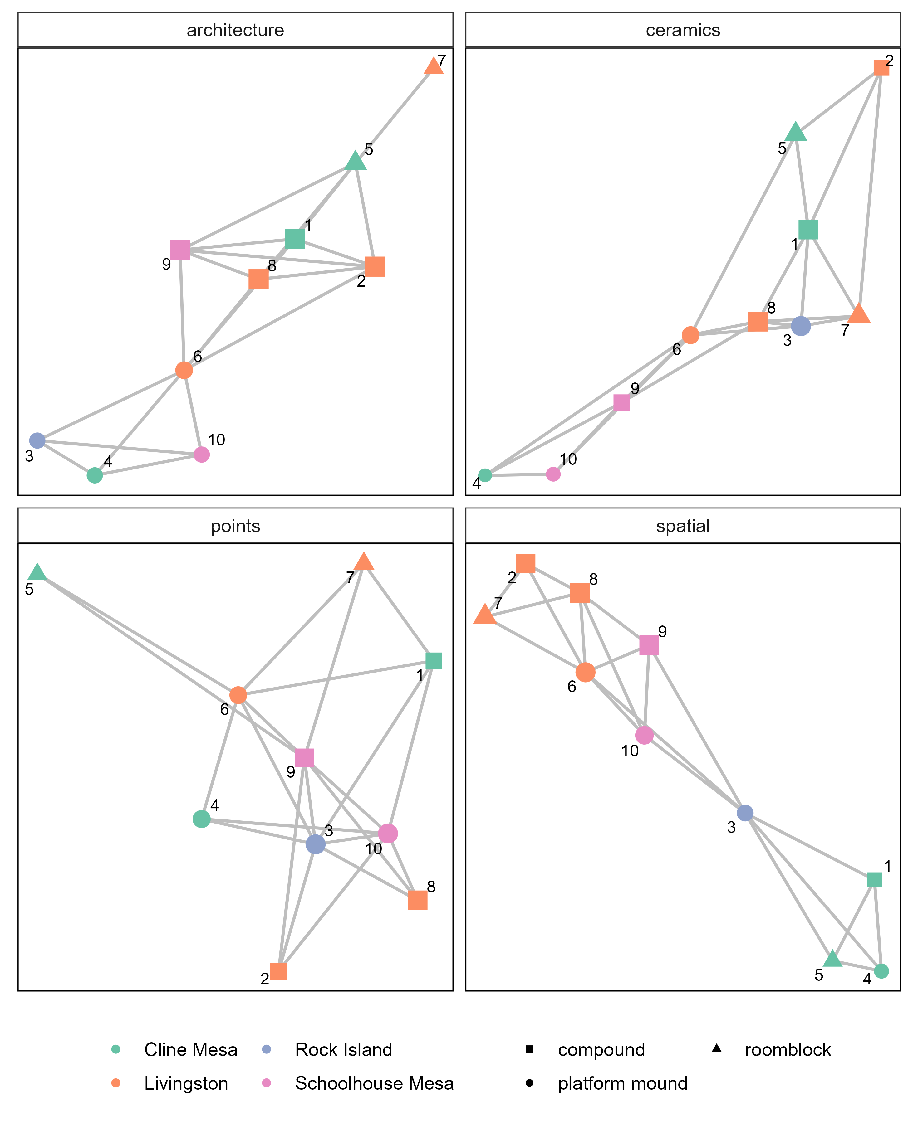 The ceramic network consists of 28 decorated types (plain wares and most undifferentiated types were removed from the analysis. The ceramic data was accessed from the cyberSW database (B. Mills et al. 2020), which keeps the full citations for the ceramic data. The ceramic data was merged with the projectile point and architectural data by site names using the semi-automated ArchaMap application (part of the CatMapper family of tools, Hruschka et al. 2022), which stores the merge for reproducibility (https://catmapper.org/archamap/AD944). The standard caveats for ceramic analysis apply to this analysis as well–problems with sherd misidentification and other data errors.