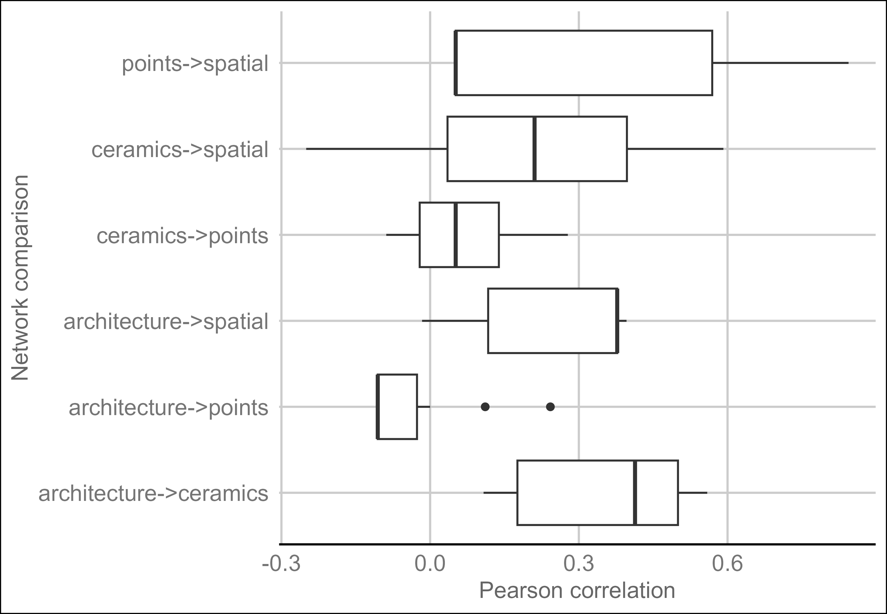 A single network is typically used in network analyses, but multilayer networks can be more informative. Multilayer networks are layered networks where nodes have different types of connections (Kivelä et al. 2014). In this analysis, each network has the same nodes–each archaeological site–but different types of relationships between them. The combination of these individual networks is a multilayer network (also called a multiplex network). Multilayer networks allow for methods to be applied on multiple networks at once (see Bródka et al. 2018). The method applicable to this analysis is layer correlation. Either Pearson or Spearman rank correlation can be computed to determine the strength and direction of correlation between each layer. Bródka and colleagues (2018) have provided an R (Team, R Core 2024) package to compute these statistics. They recommend the Pearson correlation in most circumstances. I use the results of the Pearson correlation, but the Spearman correlation provided similar results. Eigenvector centrality was mentioned in the previous section, but it is also calculated as a multilayer eigenvector centrality. In this case the centrality measure is simply the mean of the eigenvector centrality for each separate layer, as the layers are not interdependent (Frost 2022). Multilayer eigenvector centrality results are only presented for the combination of ceramic and point layers. These networks can be thought of as dependent variables for the spatial and architectural networks–meaning spatial distance and architecture are considered important variables determining the structure of the ceramic and point networks.