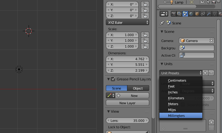 Blender does not use real world measurements by default. To change this, first select Scene on the properties window located by default on the far right (the icon has a sun, globe, and cylinder). In the Units section select Unit Presets (as shown in the screenshot above) and select Millimeters. Any unit can be used if desired, but millimeter is the default unit for STLs, which is the most commonly used file type for 3D printing. After changing the scene unit the dimensions will now have mm.
