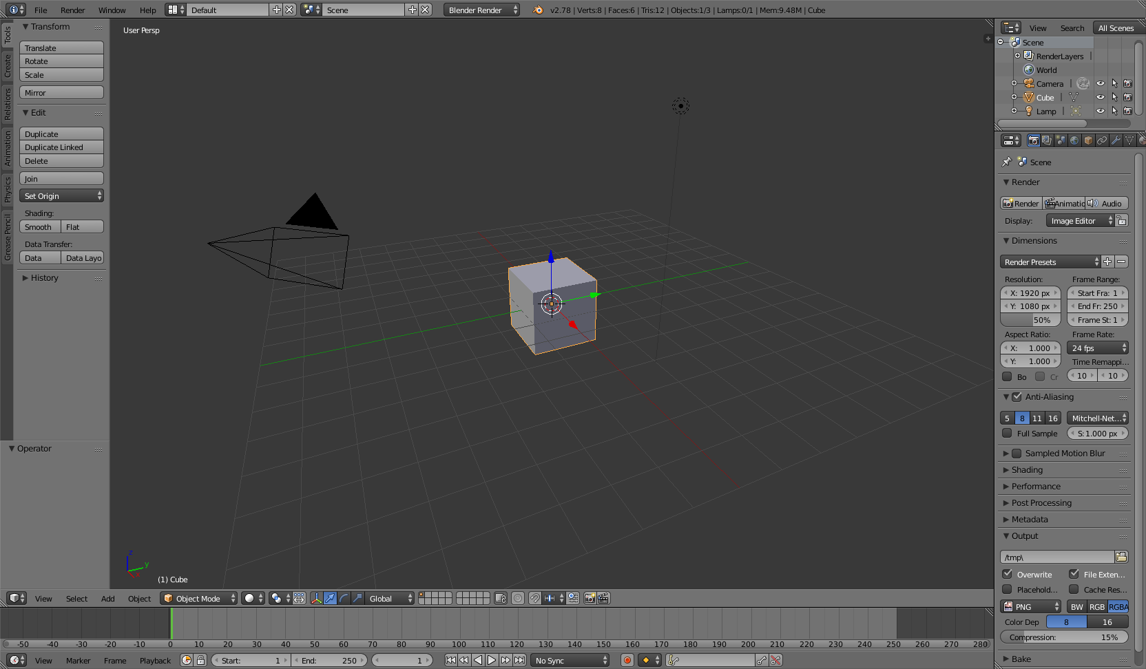 If you have the default setup for Blender, then the first step is to remove the default cube. This is done by first selecting the object. Right click on the cube and it will be outlined in orange. Then, with the mouse inside the 3D View window (keyboard shortcuts only work if the mouse is hovering in the right area), press X or the delete key. A menu will appear, click delete.