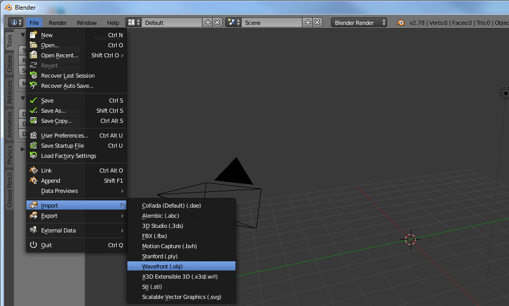 The next step is to import the 3D model (this tutorial uses OBJ, but is similar for other file types). Select the following from the menu: File→Import→Wavefront (.obj).