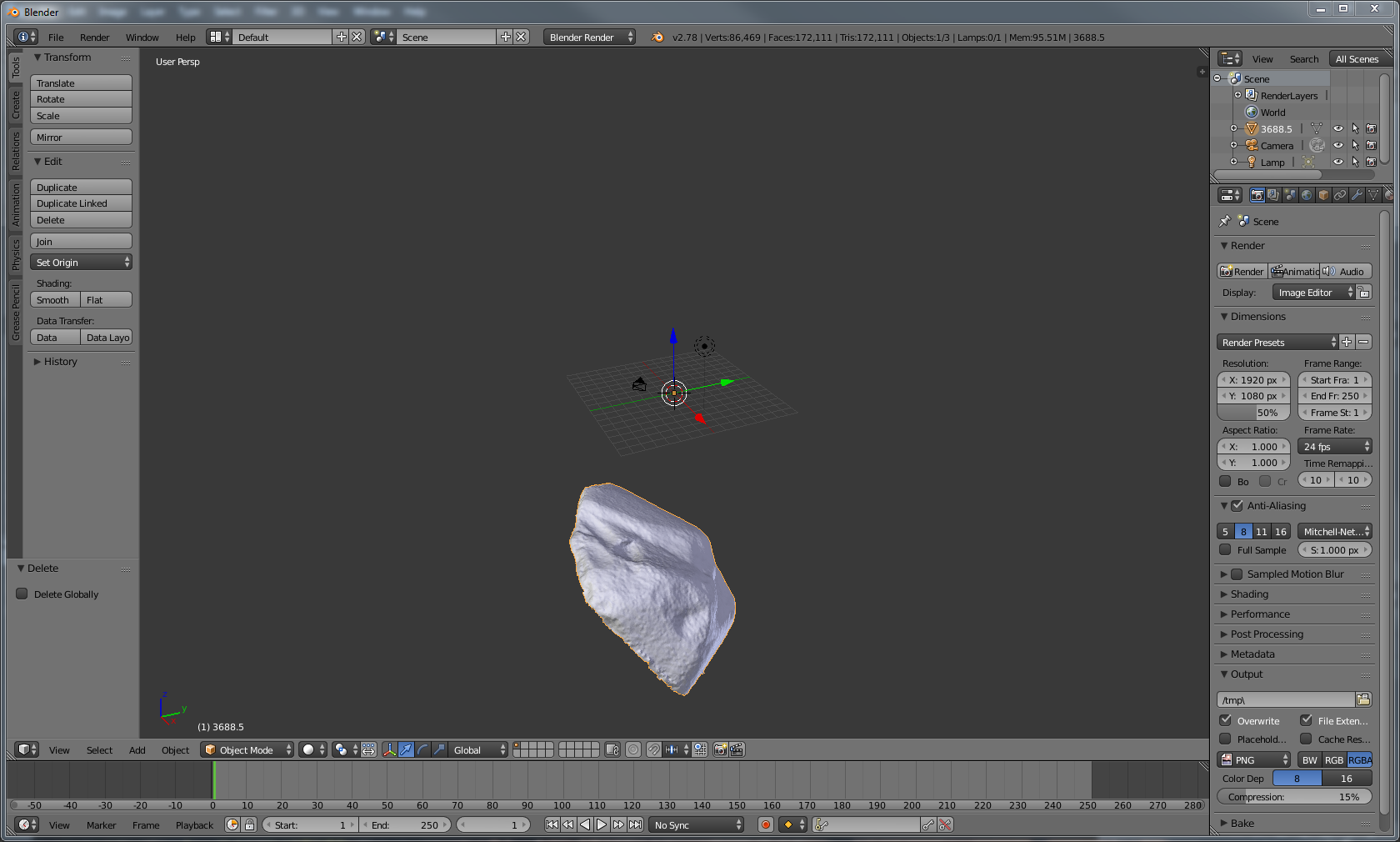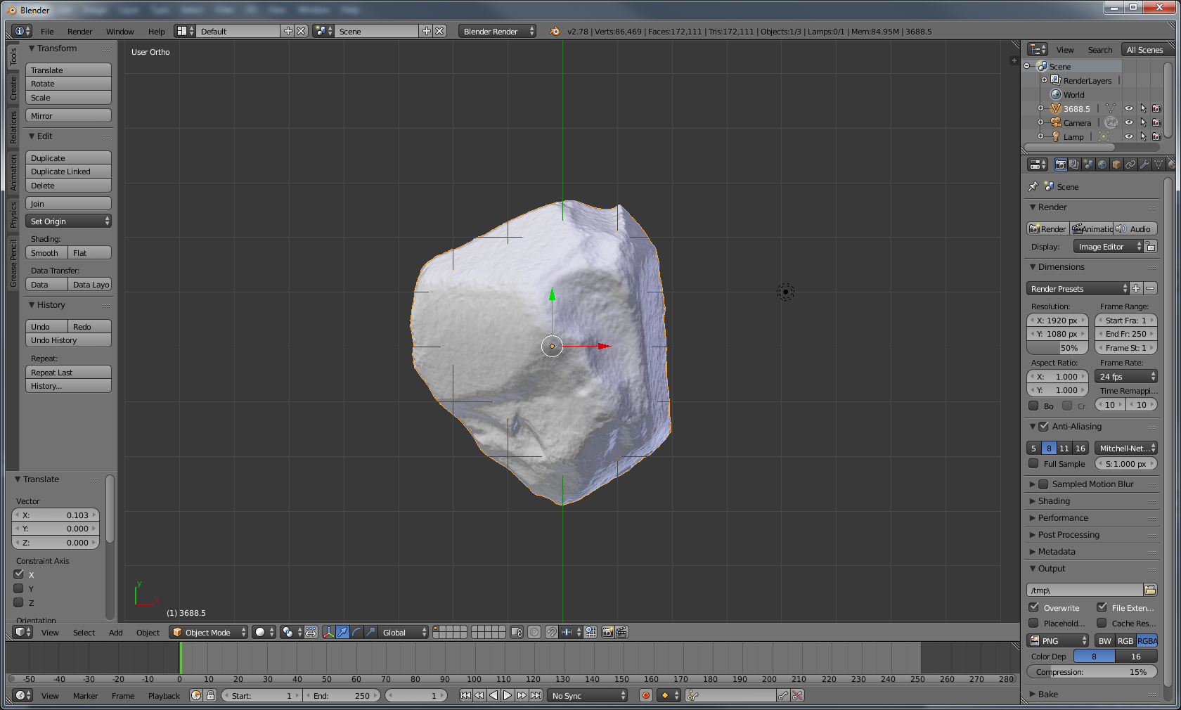 Once the object is loaded it should appear in the view screen. Occasionally the object will not be visible, either due to its small size or that the 3D model is located far from the origin. The easiest way to find the model is to press . on the numpad (note that only the numpad can be used for navigation unless changed in the Blender settings). Another method is to use the toolbar on the bottom of the 3D View window (the lowest screen is defaulted to the timeline window and selections from this toolbar will not affect the 3D view; see a general Blender tutorial for more details). Select View→Align View→View selected to view the object. This only works on the selected object. Another way to select an object is to use the Outliner window located in the top right of the default window. Any object in this window can be selected by left-clicking it.