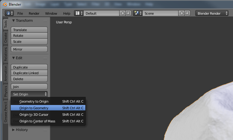 If the imported object looks correct, then next we adjust the origin to make the object easier to manage (assuming the 3D model isn’t tied to a meaningful origin point [it usually isn’t]). The orientation of the selected object can be changed using the Tool Shelf. This panel can be viewed/hidden by pressing T on the keyboard. The first tab on the Tool Shelf is labeled Tools. Select set origin and a menu will appear. Select the first option (Geometry to Origin). This will move the object to the center (use . on the numpad to reorient the 3D Viewer).