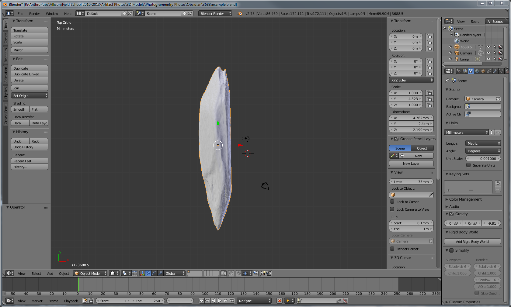 3D models are great for measurements that are difficult to obtain from physical objects, but first the 3D model itself must be the right size. Many laser scanners or structured-light scanners automatically scale the object, but often models created using photogrammetry lack a true scale. Whatever the reason you need a 3D object scaled to the right size, this tutorial will show you a simple method using Blender.